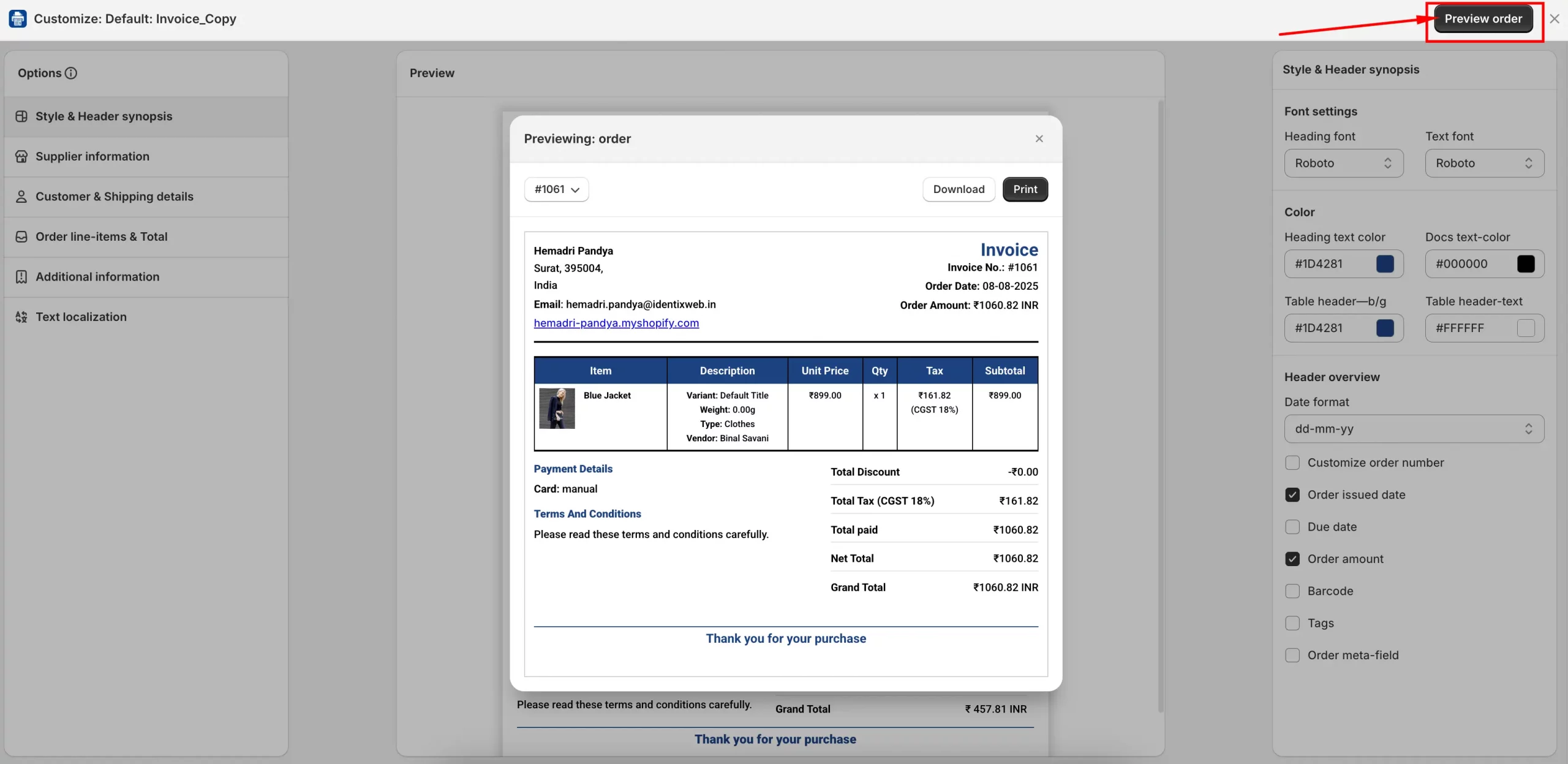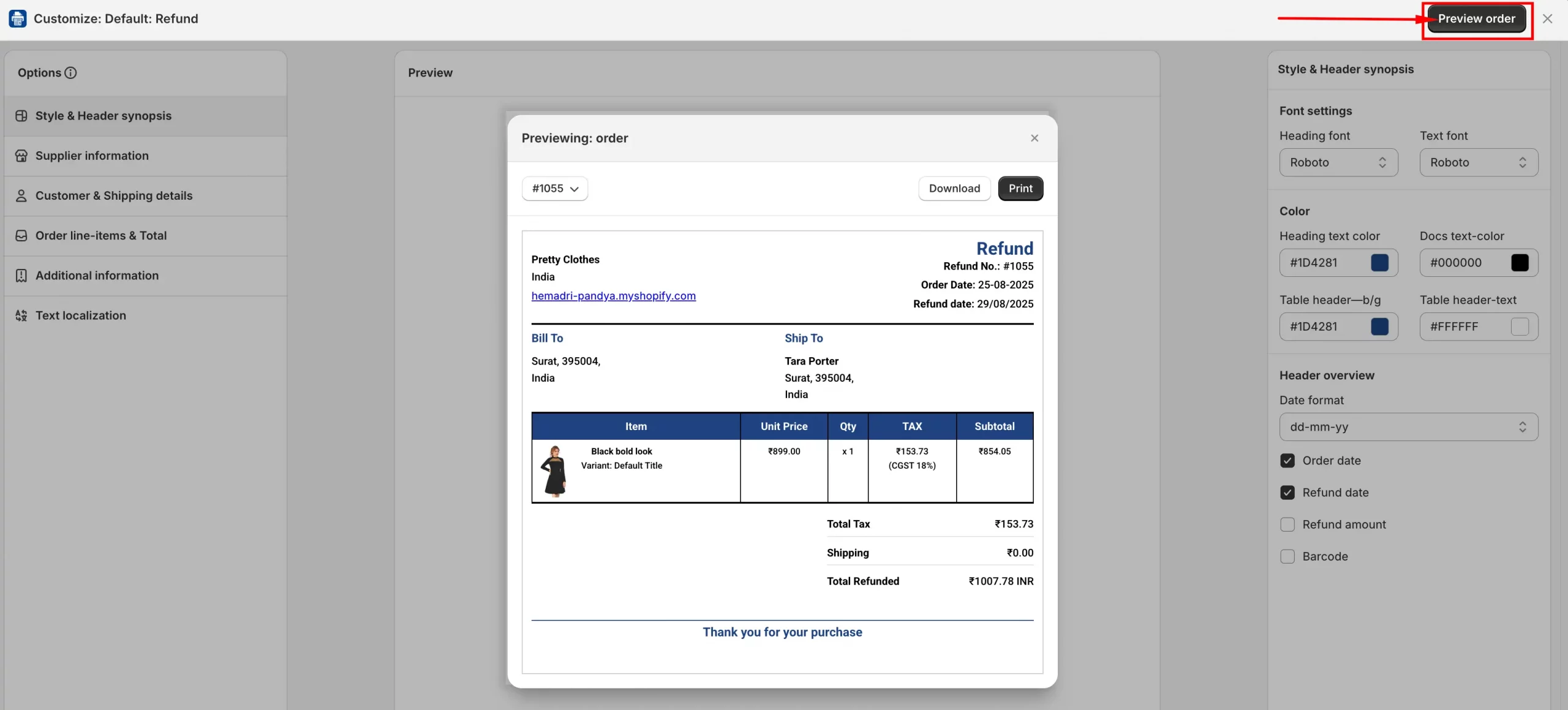 The Preview Order button allows you to see how your Invoice, Packing Slip, or Refund template will look before printing or sharing it. This feature is available on the Customize Page for each template. With it, you can: