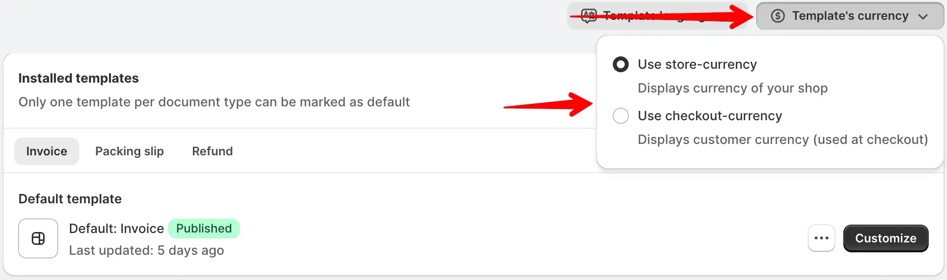 Template Currency: Customize the currency displayed on your templates to match your store currency or select the checkout currency for orders, enhancing clarity and transparency.