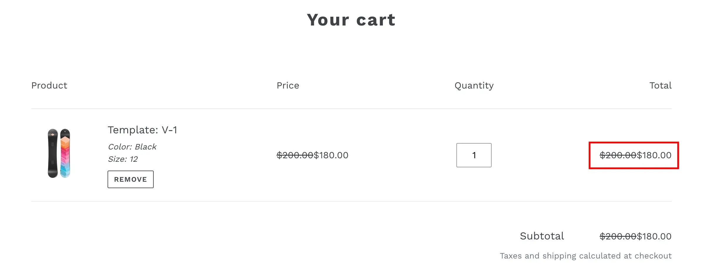 -> The line item total price selector is required when the total price of a product (calculated as quantity multiplied by the unit price) is not showing in the cart after applying discounts. If the app fails to override or update the total, you can copy the theme’s selector for the total price element and paste it here. This ensures that the cart reflects the correct discounted total price for each product line item.