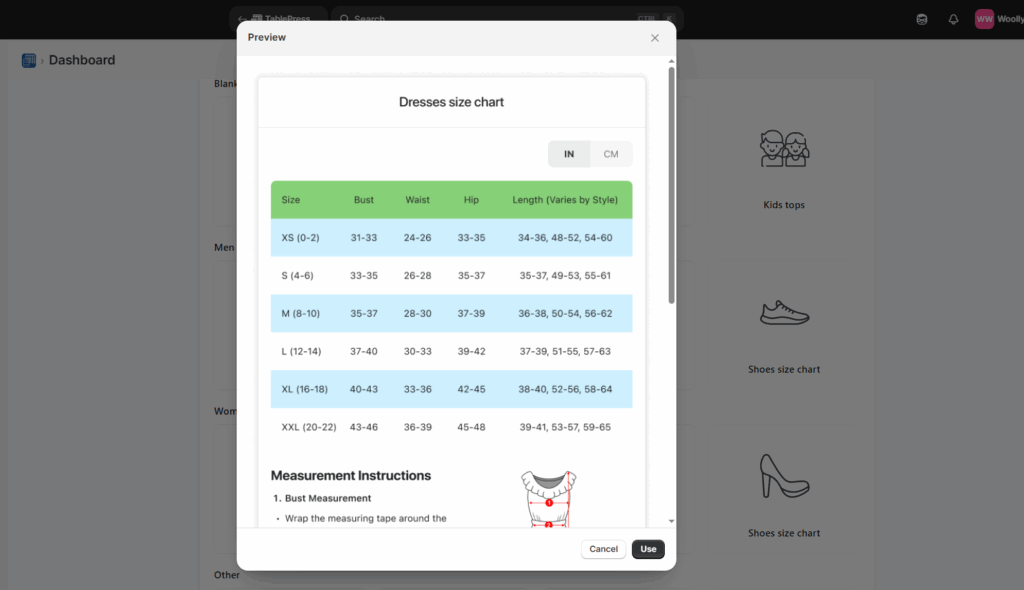 To add a size chart in Shopify under 5 minutes, use Shopify apps like TablePress where you can just select the template, the page on which the tables are to be displayed and add the details.