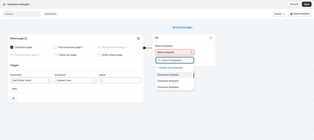Choose the checkout page, set the conditions under which you want to display the upsell and select the template and save changes.