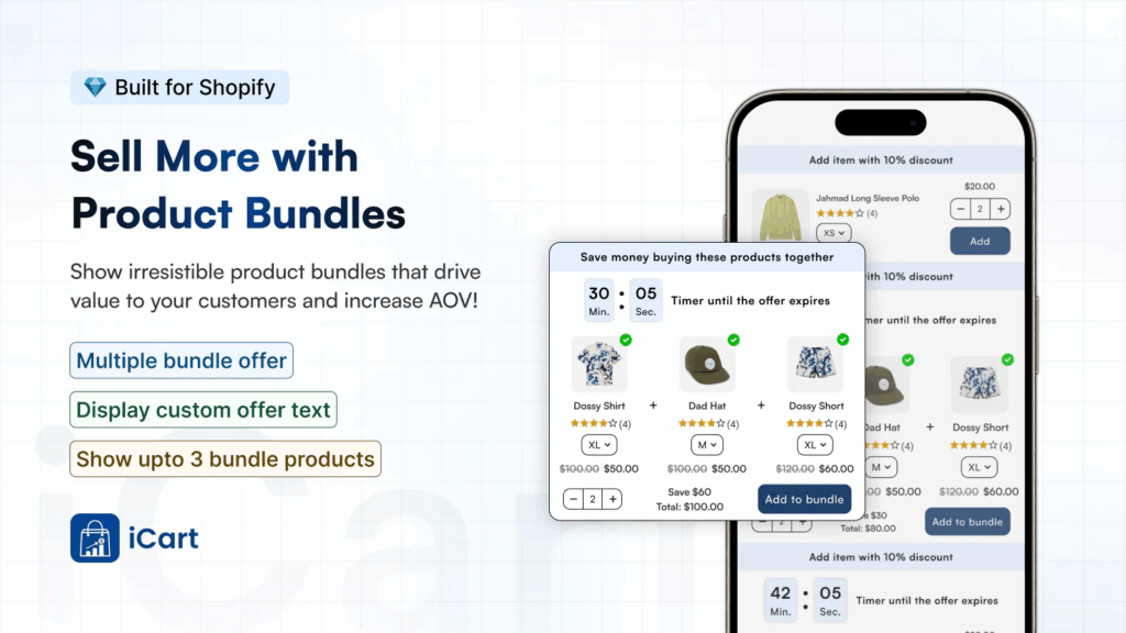 Apps like iCart Cart Drawer Cart Upsell combine bundling with cart drawer optimization and upselling in one system which is built for Shopify. Instead of only creating a bundle product in Shopify, you optimize the entire checkout experience.