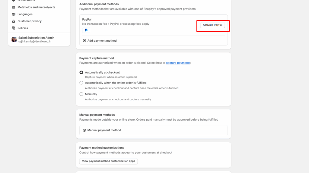 - Go to Shopify admin > Settings > Payments.
