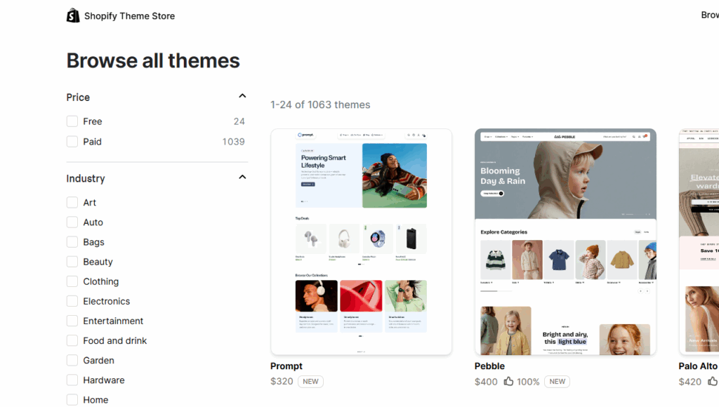 Shopify’s Theme Store lists 1000+ free and paid themes, and you can filter them by industry, catalog size, and features.
