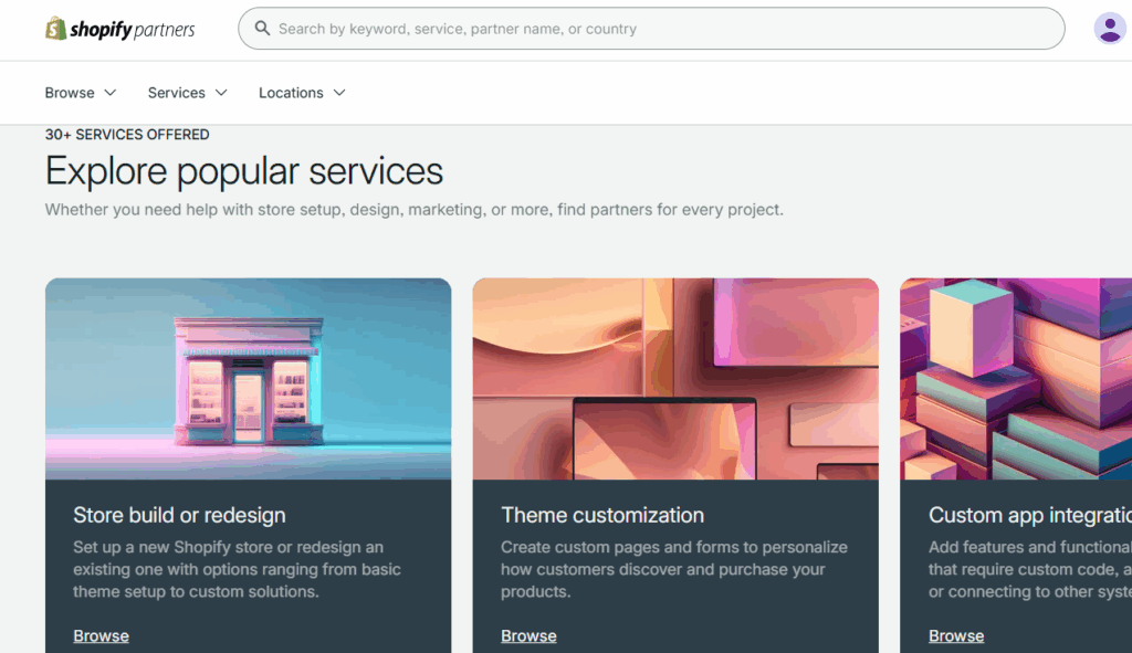 Use Shopify’s Partner Directory. It’s built for merchants who want to hire vetted Shopify partners. They offer 30+ service categories, including theme customization.