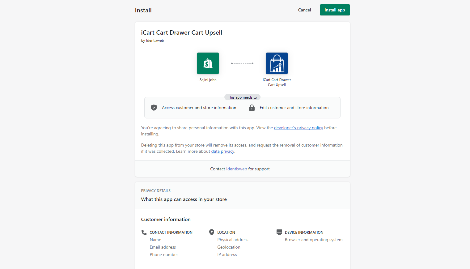 Step 3: Here in this step iCart asks access for a few things from you. Read the lines and click on the “Install app” button.