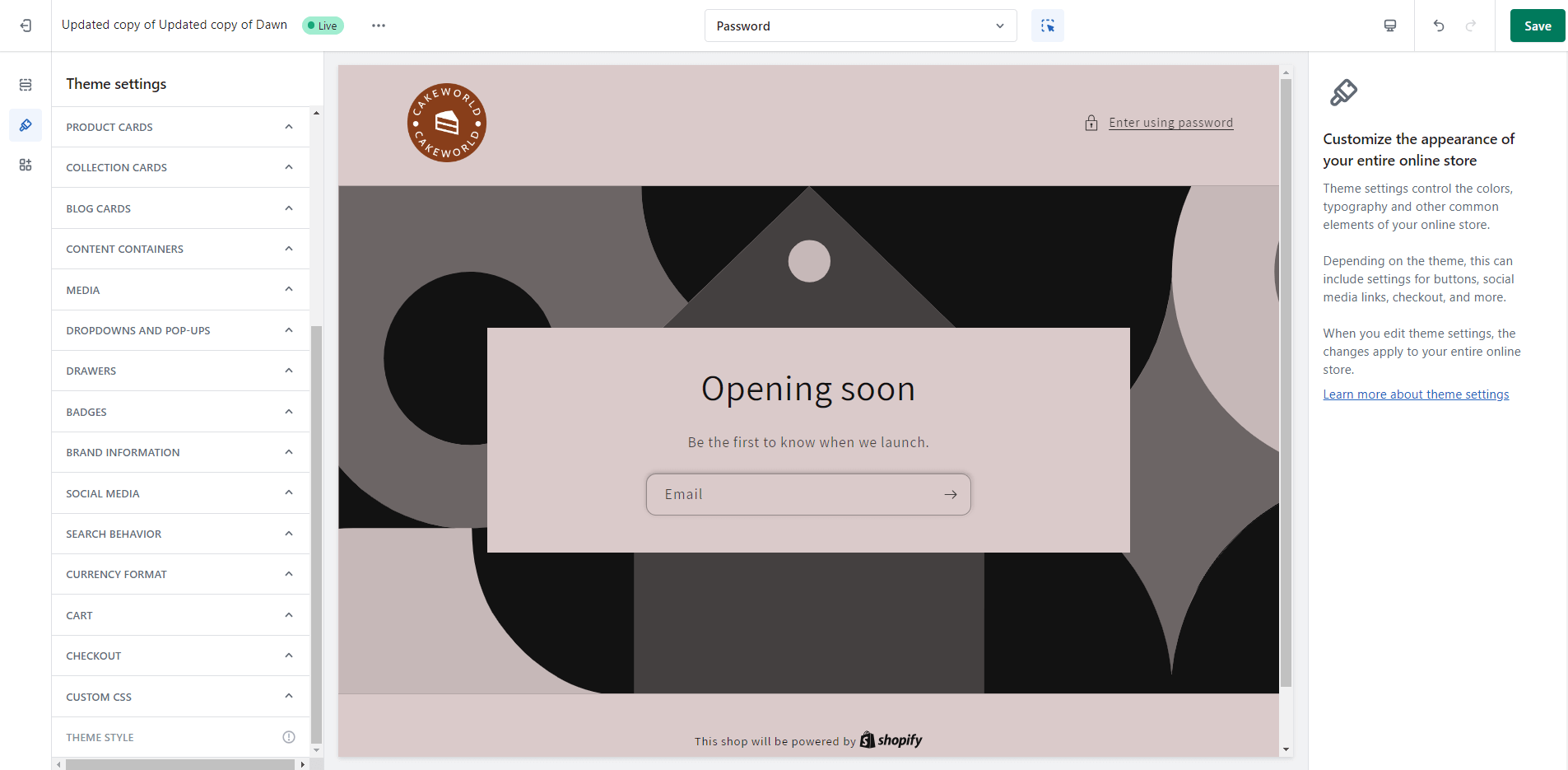 2. Go to the theme settings to upload your logo image. This will replace the store name text with the picture.