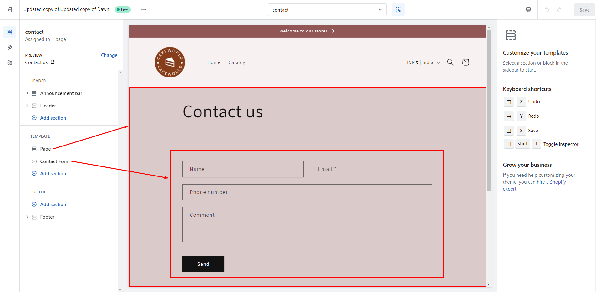 The contact page has two sections by default: Page and Contact Form. You can add other sections to this page based on your store's requirements.