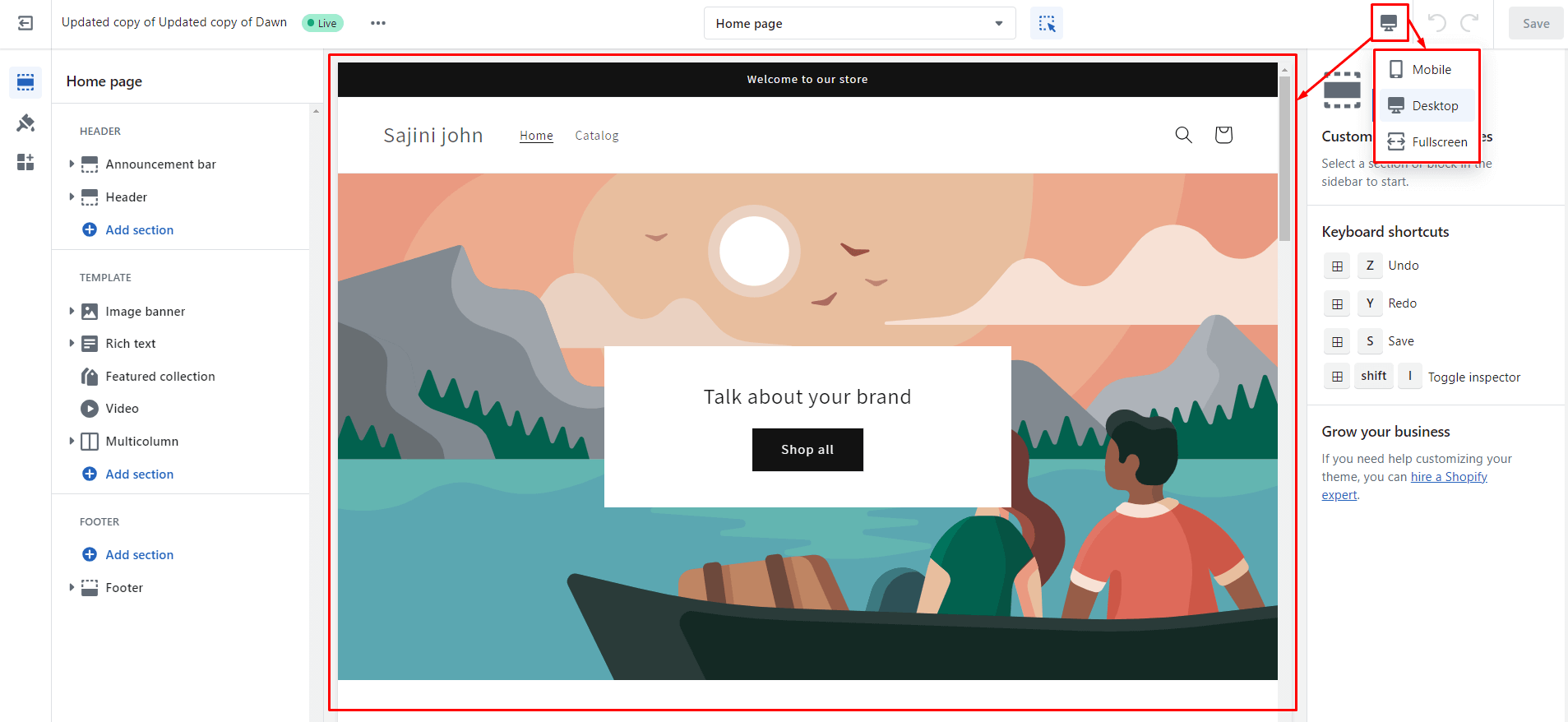 We will explore Dawn's editor. If your store uses a different version of the Dawn theme, the options and editor layout mentioned in this guide may vary. If you have not updated your version yet, it’s time to update and take advantage of the newly launched features of the theme. As you can see, I am ready to start our journey with the Dawn theme editor. Let’s get started!