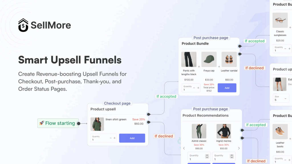 Showing just one offer leaves revenue on the table. Instead of presenting a single upsell, structure a funnel that adapts based on the customer’s response. Smart funnel logic increases total revenue per order without overwhelming the buyer. If you’d like to see how real brands structure their offers, you can explore these post-purchase upsell pages examples to understand what high-converting implementations look like in practice.