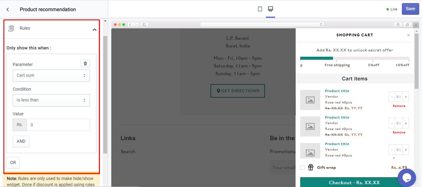 Rules are used to hide/show the discount widget. Once if the discount is applied using rules then it will not get removed automatically using any rules. This option allows you to change your product recommendation offers based on different parameters like: